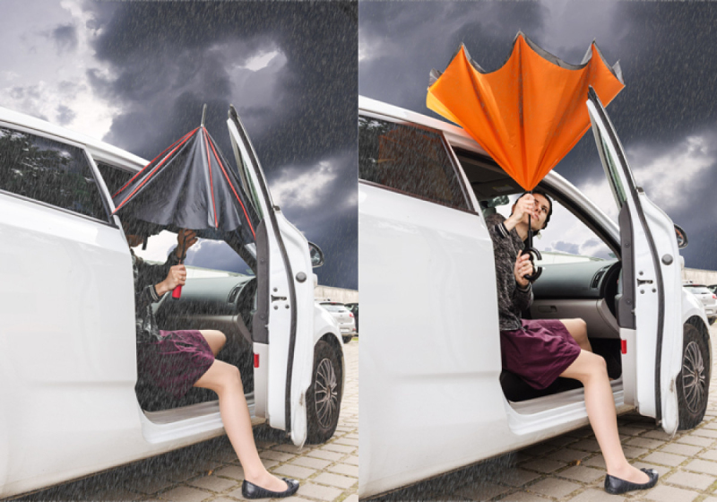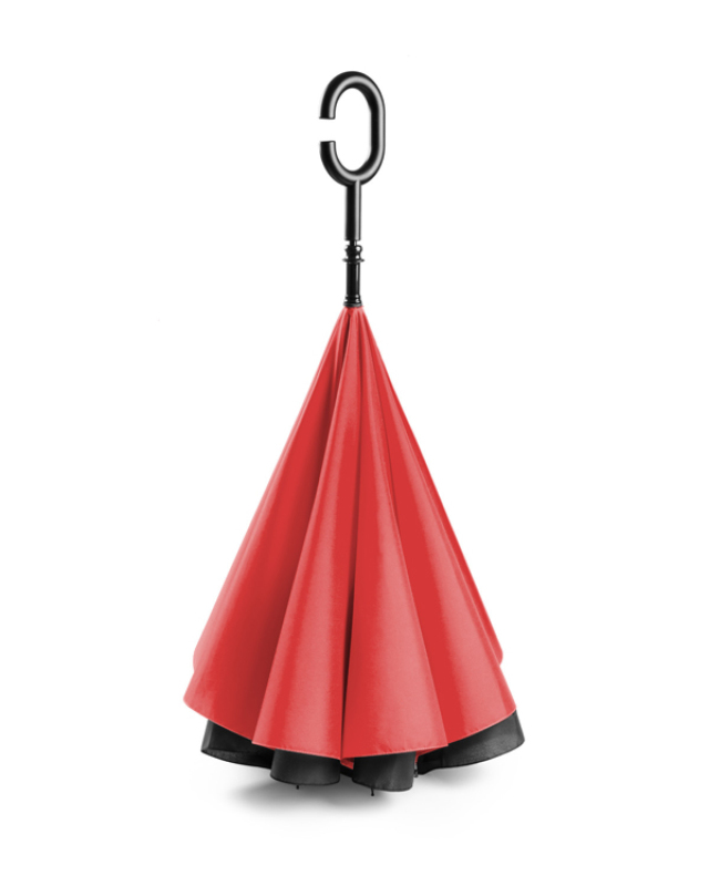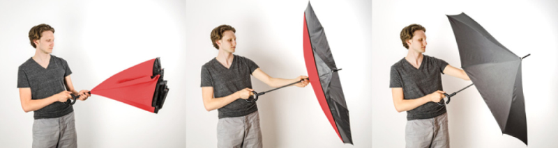 Revolutionární REVERS deštník se odlišuje svým tvar a funkčností. Pomocí reverzního pohybu při zavírání deštníku zůstává voda, která se na kupoli usadila, uvnitř deštníku, takže uživatel a okolní oblast zůstávají suché. Navíc deštník má výjimečnou rukojeť, která je velmi užitečná, když potřebujete něco udělat oběma rukama.