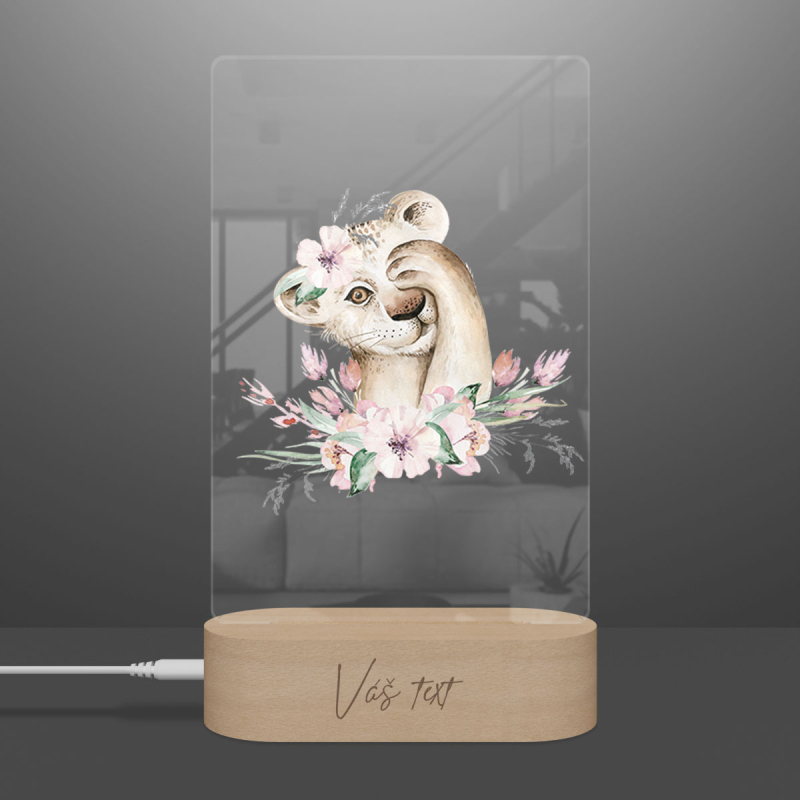 Součástí balení je akrylové sklo dle výběru, dřevěný RGB LED stojánek a napájecí USB kabel.
