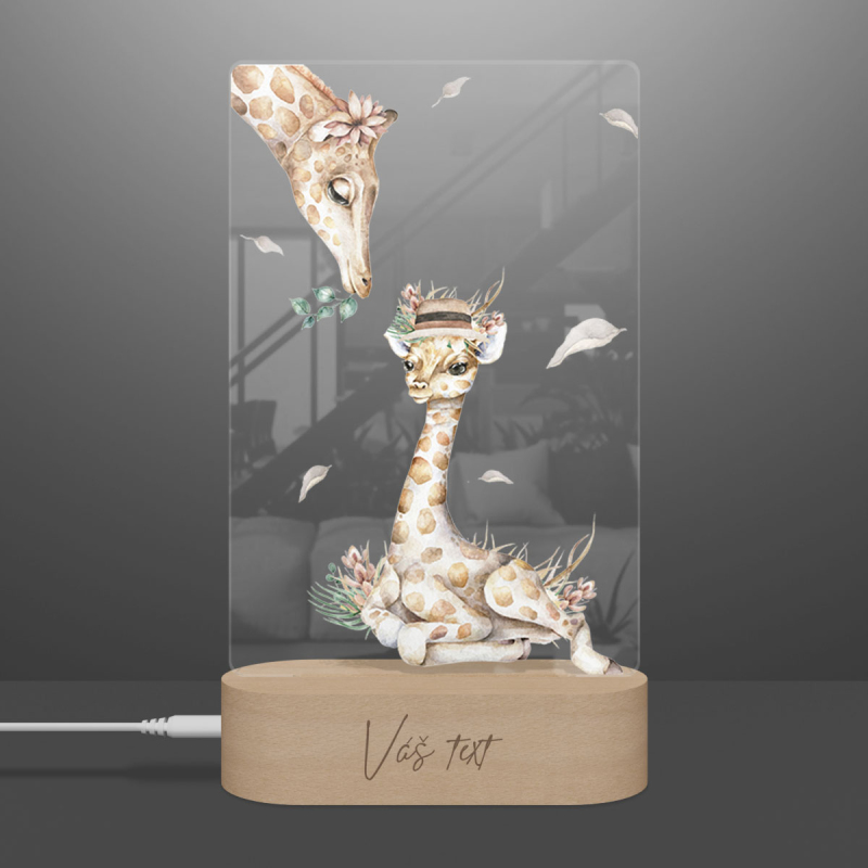 Součástí balení je akrylové sklo dle výběru, dřevěný RGB LED stojánek a napájecí USB kabel.