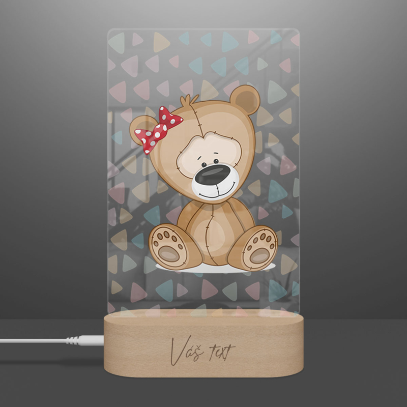 Součástí balení je akrylové sklo dle výběru, dřevěný RGB LED stojánek a napájecí USB kabel.