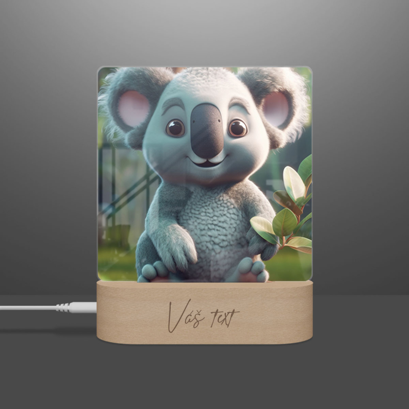 Součástí balení je akrylové sklo dle výběru, dřevěný RGB LED stojánek a napájecí USB kabel.