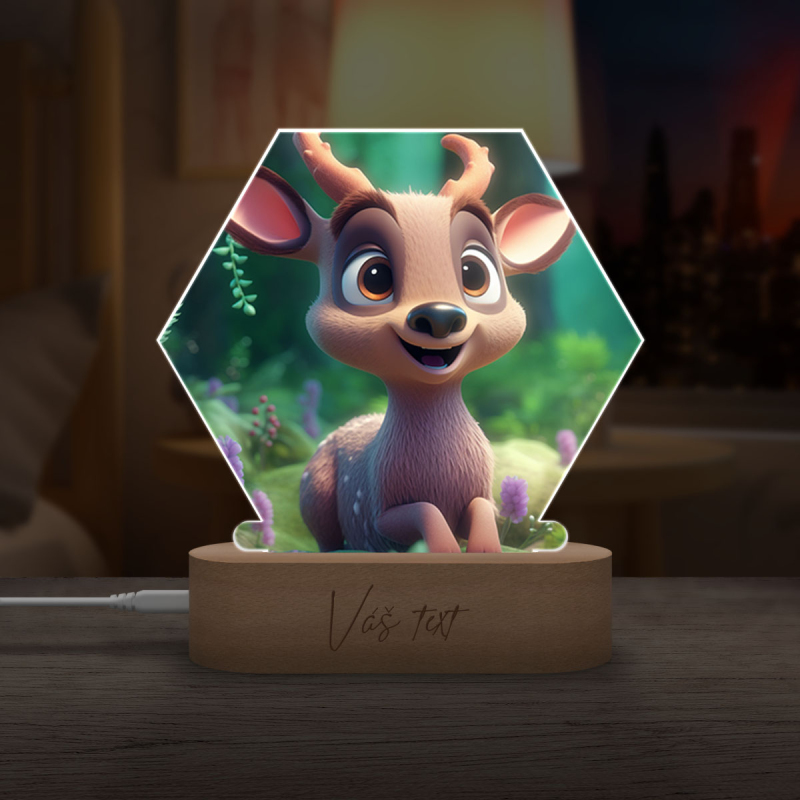 Součástí balení je akrylové sklo dle výběru, dřevěný RGB LED stojánek a napájecí USB kabel.