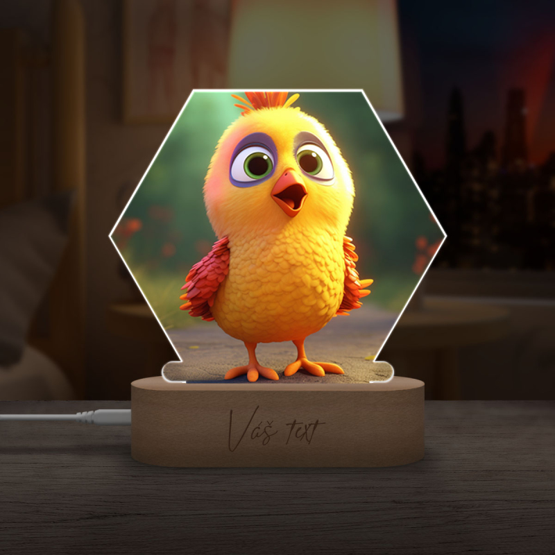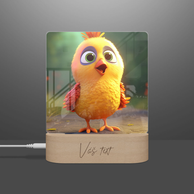 Součástí balení je akrylové sklo dle výběru, dřevěný RGB LED stojánek a napájecí USB kabel.