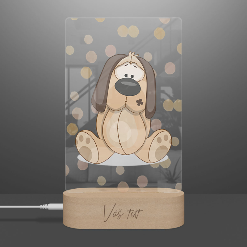 Součástí balení je akrylové sklo dle výběru, dřevěný RGB LED stojánek a napájecí USB kabel.