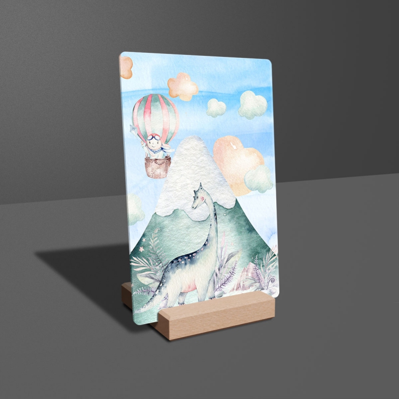 Na produktovém fotu vyobrazena nejoblíbenější varianta akrylového skla 14x21/21x14cm a dřevěný stojánek 10x10cm.
