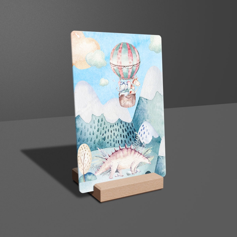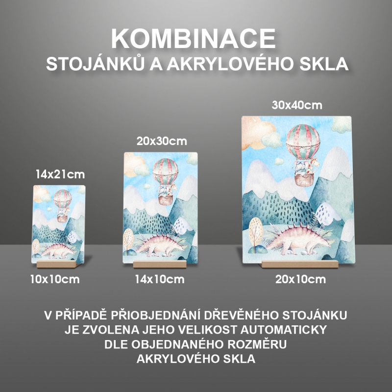 Na produktovém fotu vyobrazena nejoblíbenější varianta akrylového skla 14x21/21x14cm a dřevěný stojánek 10x10cm.