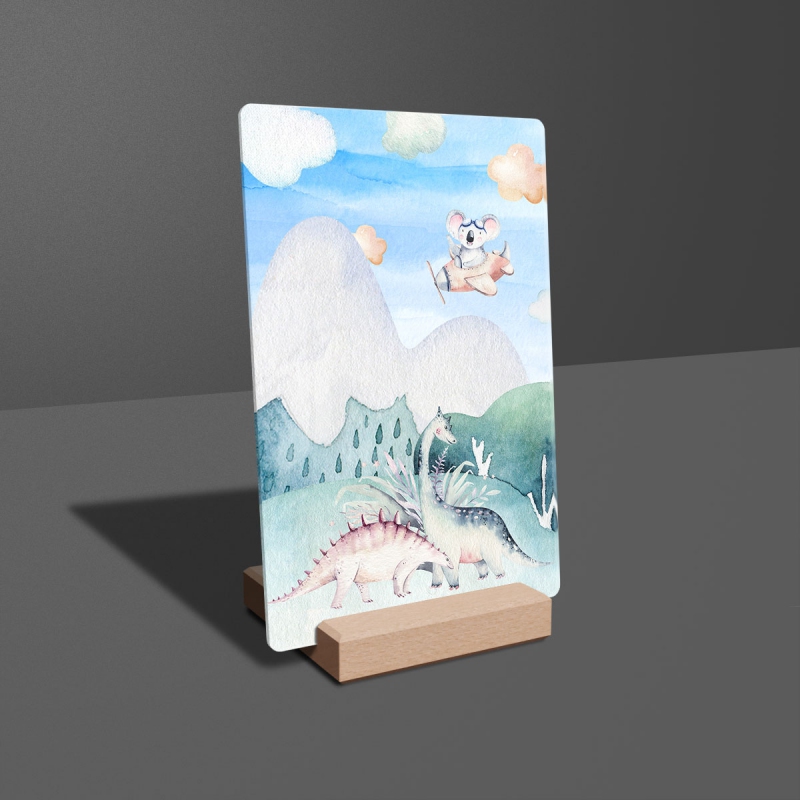 Na produktovém fotu vyobrazena nejoblíbenější varianta akrylového skla 14x21/21x14cm a dřevěný stojánek 10x10cm.