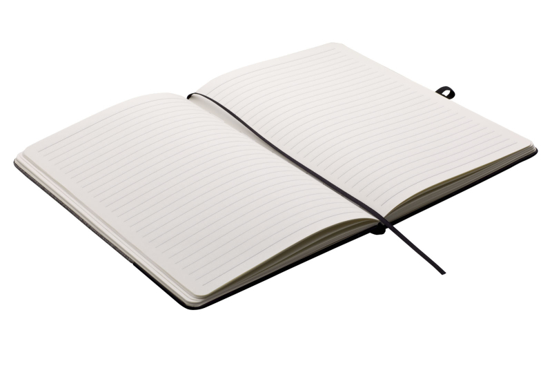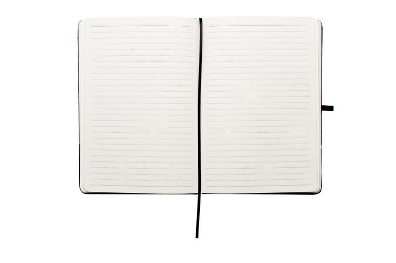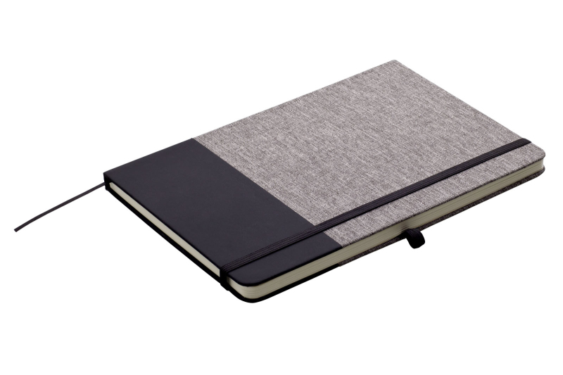 Zápisník A5 v deskách v kombinaci šedého RPET a černé PU kůže má 80 linkovaných listů. Blok má uzavírací gumičku, poutko na propisku a textilní záložku v černé barvě.