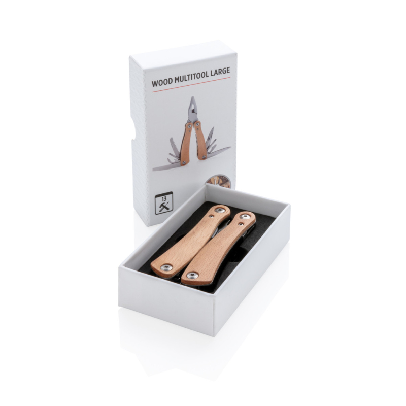 Kvalitní odolný multifunkční nůž s 13 funkcemi: kleště s jehlovou špičkou, klasické kleště, štípací kleště, nůž s rovným ostřím, nůž se zubatým ostřím, křížový šroubovák, malý, střední a velký plochý šroubovák, pilka, otvírák plechovek a lahví, pilník. Tělo ze dřeva, nástroje z prvotřídní nerezové oceli. Baleno v dárkové krabičce.