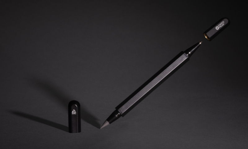 Unikátně navržené pero z recyklovaného hliníku nabízející dvě možnosti psaní. Na jedné straně grafitová tuha, na druhé straně kuličkové pero. Kuličkové pero s šiřkou 1mm, modrým inkoustem pro psaní až 1 200 m textu. Vyrobené z RCS recyklovaného hliníku. RCS (Recycled Claim Standard) je globální standard, který umožňuje ověřit použití recyklovaného materiálu v produktu napříč celým dodavatelským řetězcem. Celkový podíl recyklátu dle váhy produktu: 83 %. Baleno v elegantní FSC® dárkové krabičce Swiss Peak.
