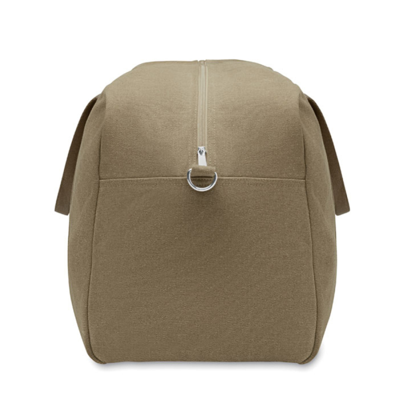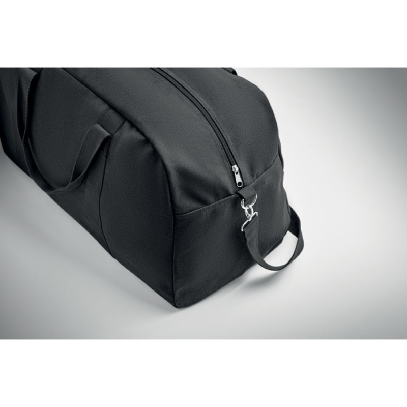 Cestovní taška z recyklovaných tkanin o gramáži 450g (60 % recyklovaná bavlna a 40 % recyklovaný polyester) s nastavitelným a odnímatelným bavlněným popruhem.