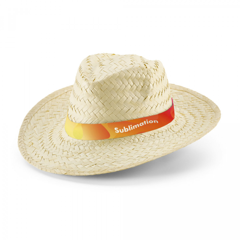 Přírodní slaměný klobouk se sublimační stuhou. Pro objednávky bez personalizace je stuha dodávána odděleně od klobouku. Velikost: 580 mm