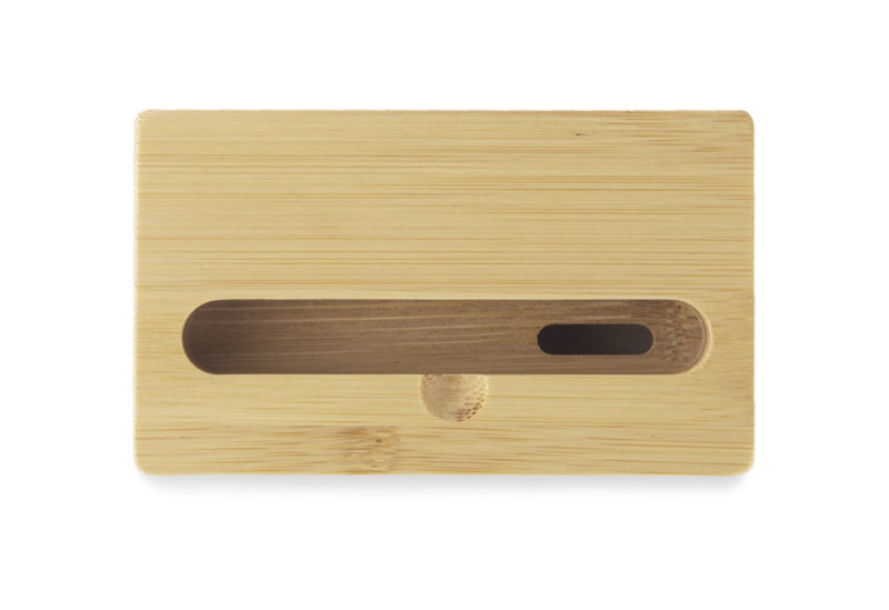 RESONA je bambusový stojánek na telefon, který zároveň slouží jako zesilovač zvuku. Díky jeho tvarování je zvuk vycházející z telefonu, který je umístěný ve stojánku, hlubší a silnější. Stojan je zabalen v hnědé kartonové krabici s infografikou naznačující jeho funkčnost.