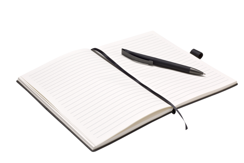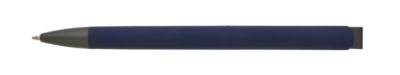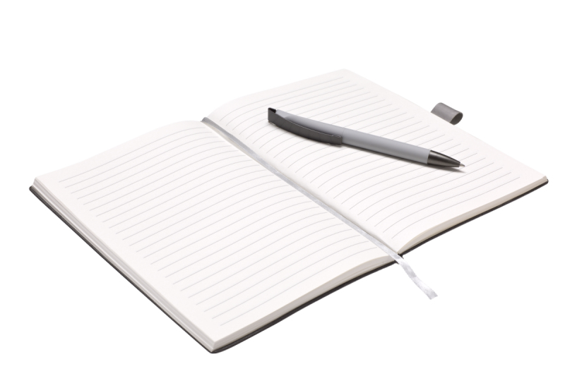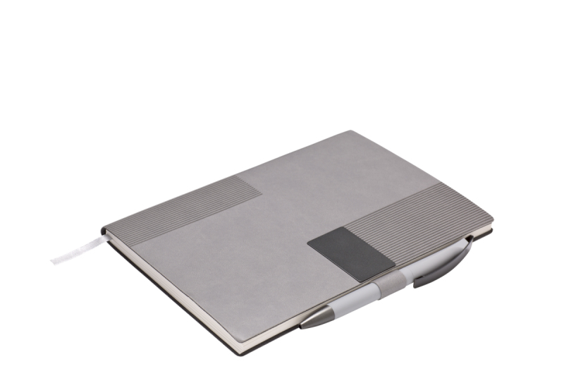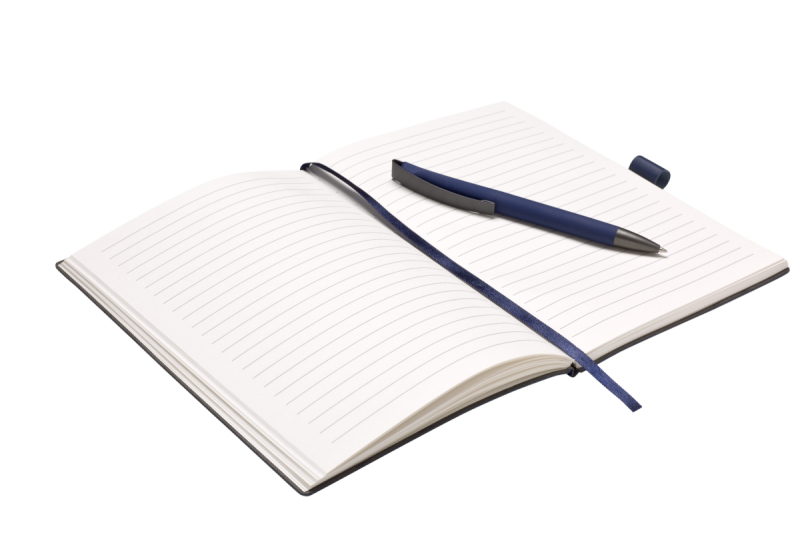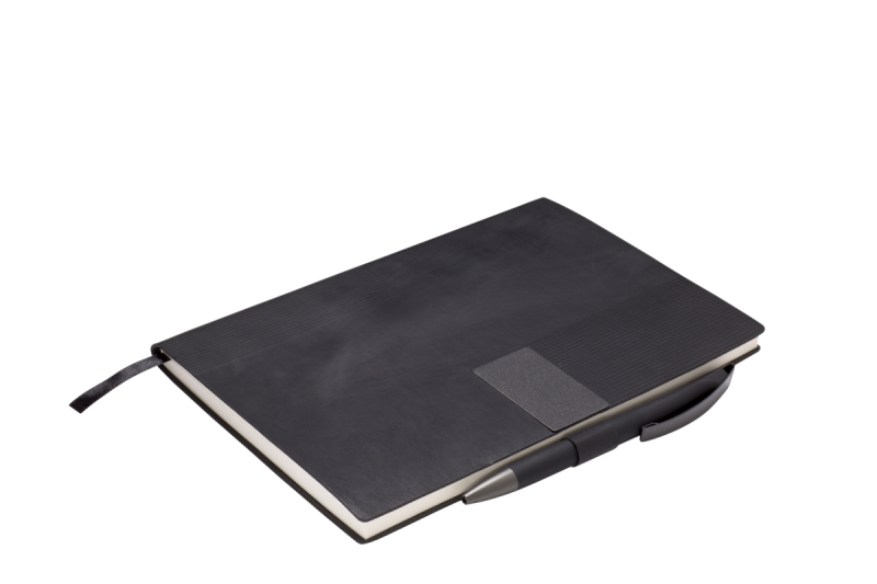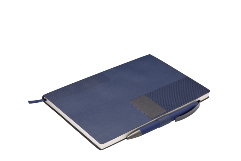 Elegantní zápisník A5 v PU deskách s 80 bílými linkovanými stranami a plastovou propiskou s pogumovaným povrchem a modře píšící náplní X20. Blok má uzavírací gumičku, poutko na propisku a textilní záložku v barvě desek.