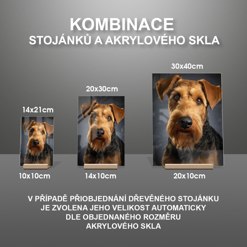 Na produktovém fotu vyobrazena nejoblíbenější varianta akrylového skla 14x21cm a dřevěný stojánek 10x10cm.