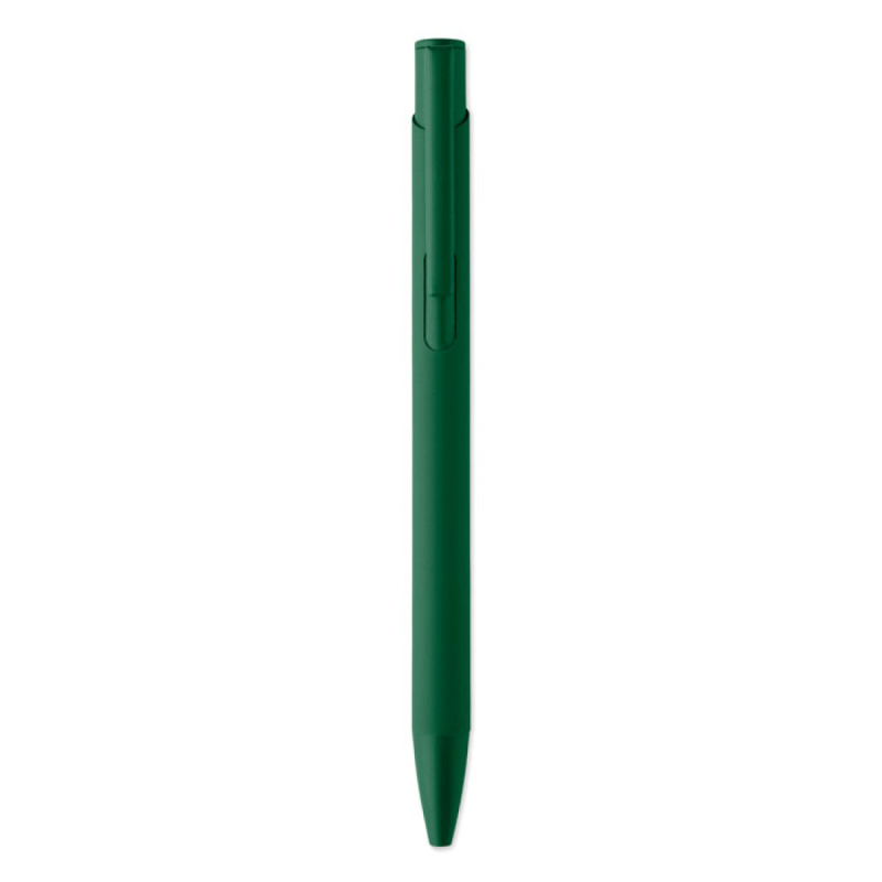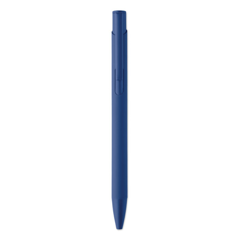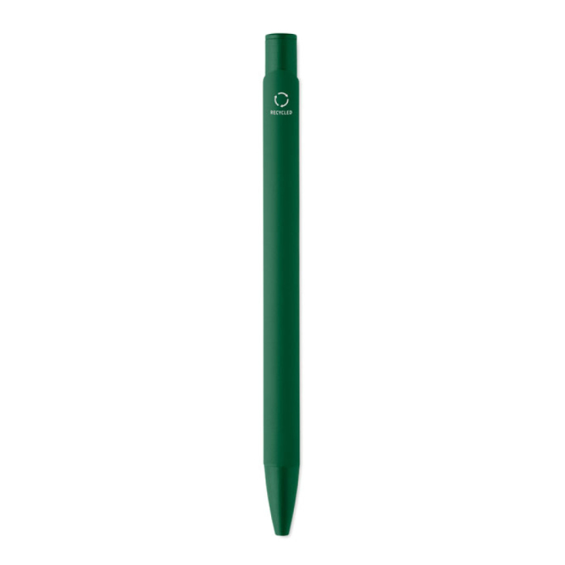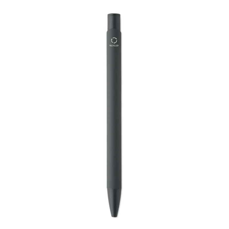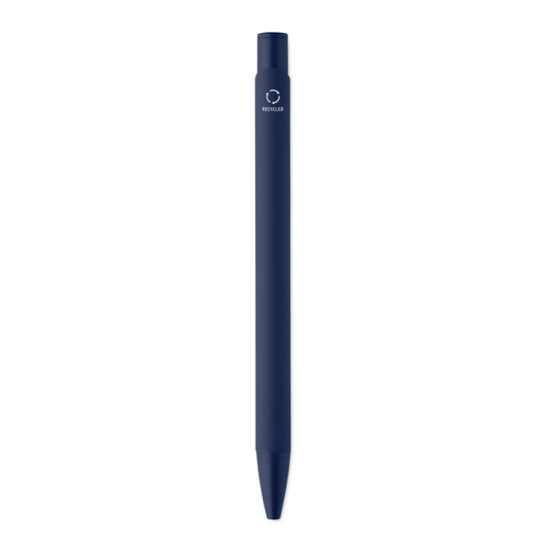 Tlačítková propiska z recyklovaného hliníku s železným klipem a barevným pogumovaným tělem. Modrý inkoust.