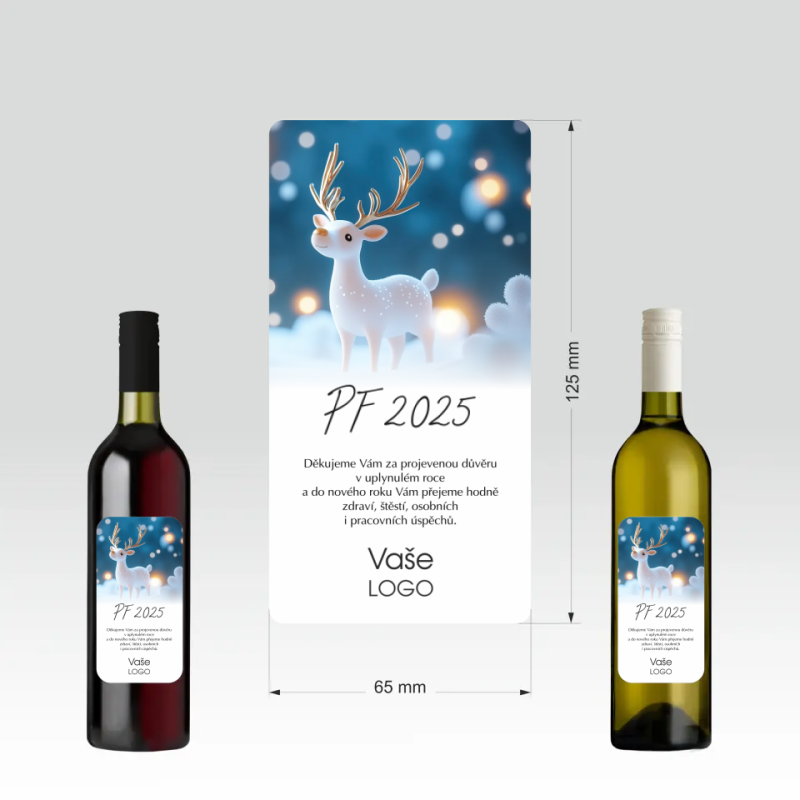 Přední stranu etikety je možné doplnit firemním logem a sladit ji tak s firemní identitou. Etiketa je vytištěna standardním digitálním potiskem. Originální a barevná etiketa láhev oživí a zároveň zaujme nejednoho obdarovaného.