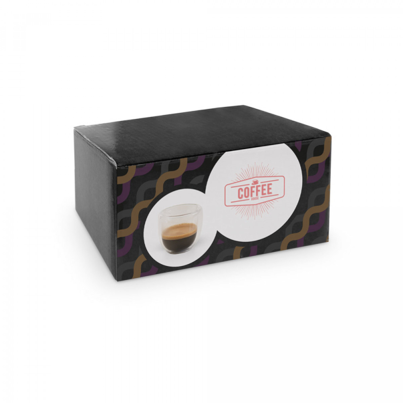 Kávová souprava se dvěma šálky z dvouplášťového izotermického skla s objemem až 75 ml. Dodáváno v personalizovatelné dárkové krabičce. Krabička: 133 x 65 x 65 mm