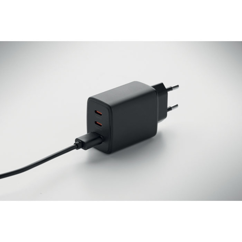 Dvoupólový síťový nabíjecí EU adaptér se 65W rychlonabíjením, 1 portem USB-A a 1 porty Type-C. Podporuje technologii Power Delivery.