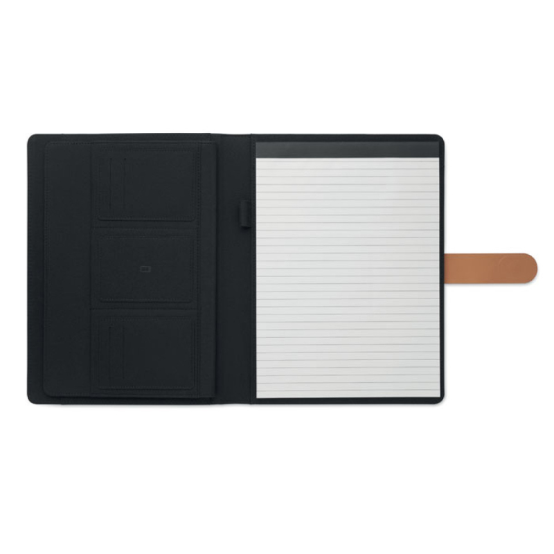 Portfolio A4 z materiálu RPET s detaily z umělé kůže. Vyměnitelný poznámkový blok A4. 30 linkovaných stran z recyklovaného papíru. Držák na tužky. Čtyři přihrádky na karty, tři malé kapsy a jedna velká přihrádka. Uzavírání na magnetický popruh.