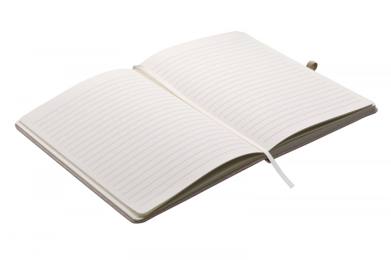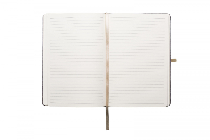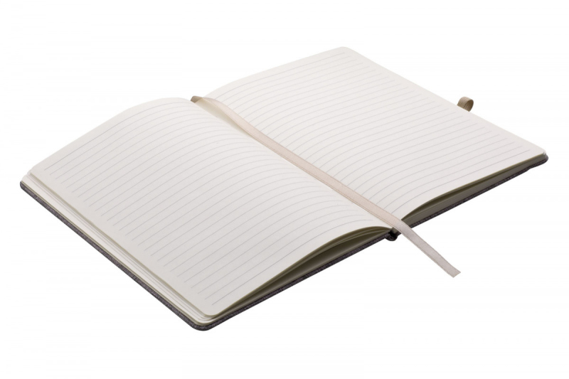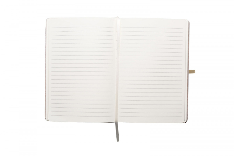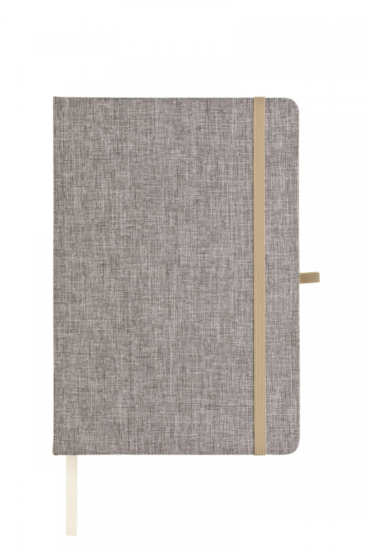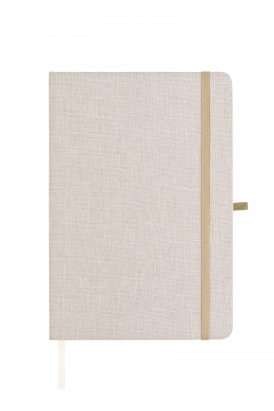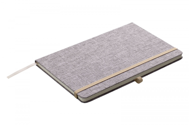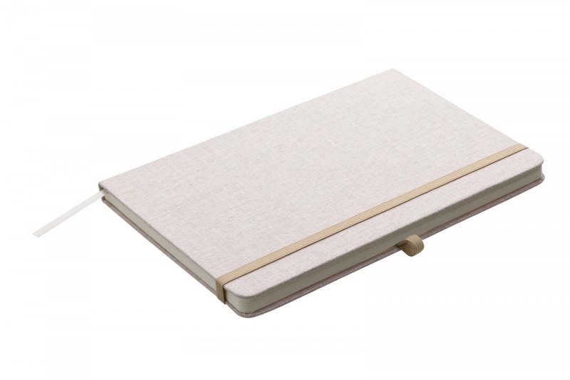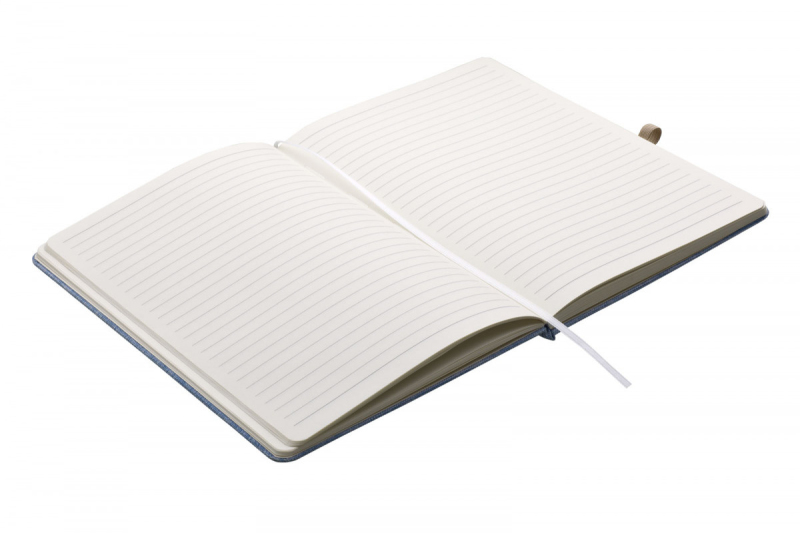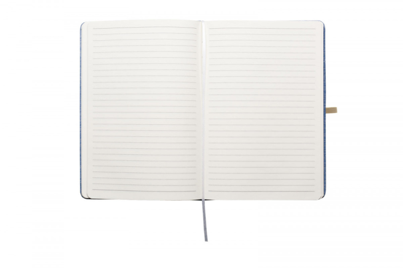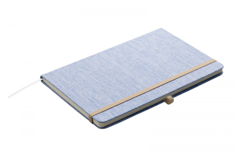 Zápisník A5 v deskách potažených světle modrou látkou z recyklované bavlny má 80 linkovaných listů. Blok má uzavírací gumičku, poutko na propisku a textilní záložku v přírodní barvě.