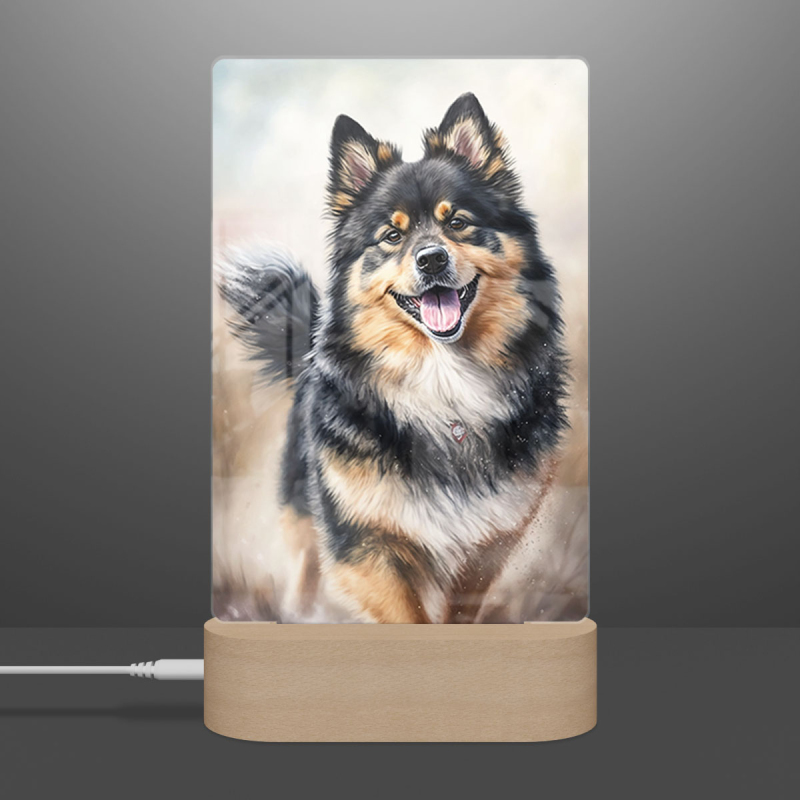 Součástí balení je akrylové sklo dle výběru, dřevěný RGB LED stojánek a napájecí USB kabel.