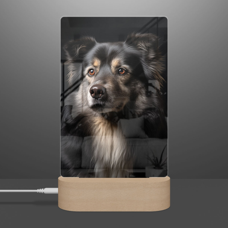 Součástí balení je akrylové sklo dle výběru, dřevěný RGB LED stojánek a napájecí USB kabel.