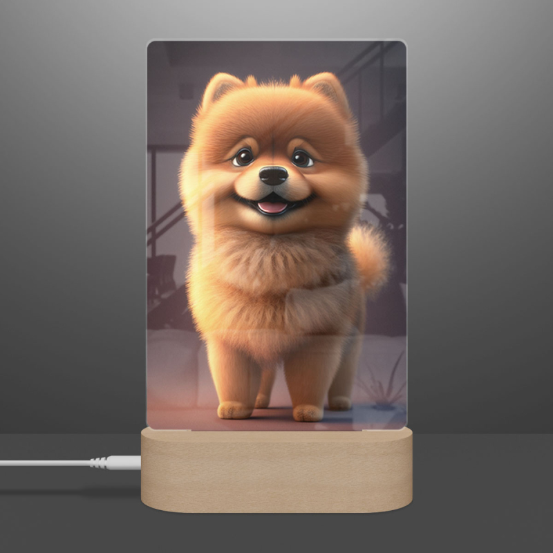 Součástí balení je akrylové sklo dle výběru, dřevěný RGB LED stojánek a napájecí USB kabel.