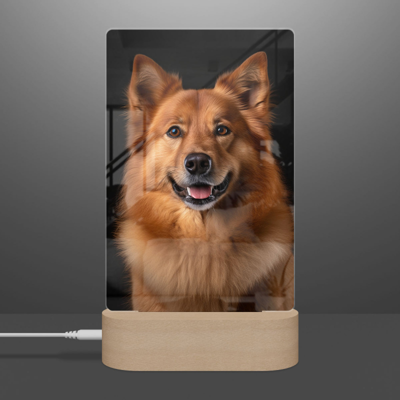 Součástí balení je akrylové sklo dle výběru, dřevěný RGB LED stojánek a napájecí USB kabel.