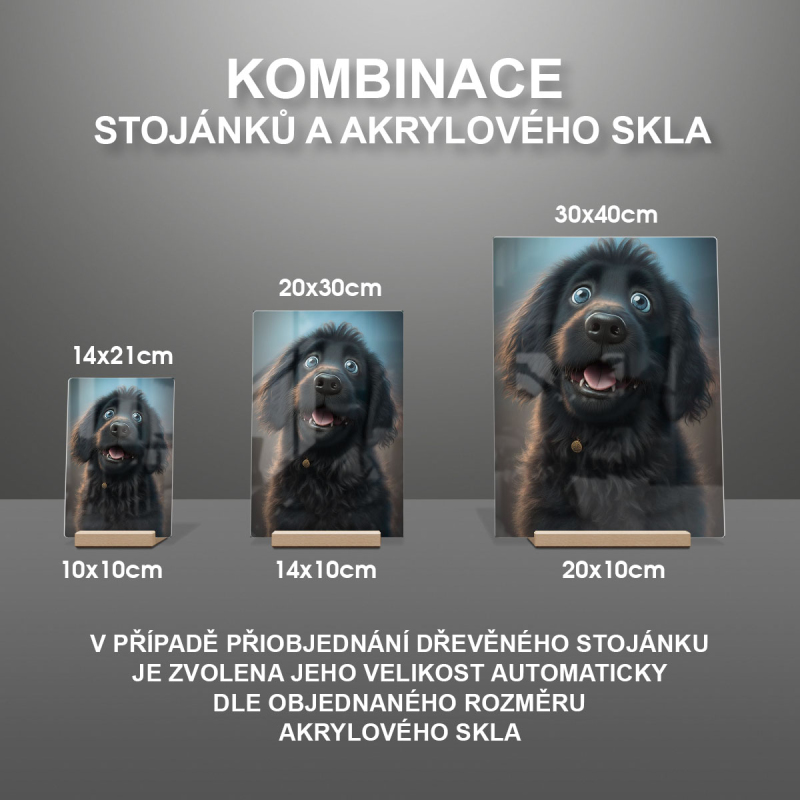 Na produktovém fotu vyobrazena nejoblíbenější varianta akrylového skla 14x21cm a dřevěný stojánek 10x10cm.
