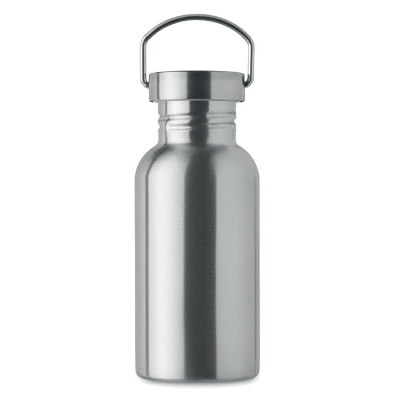 Jednostěnná láhev z recyklované nerezové oceli (90 % recyklovaná nerezová ocel a 10 % nerezová ocel) s víčkem s rukojetí. Neteče. Objem: 500 ml.