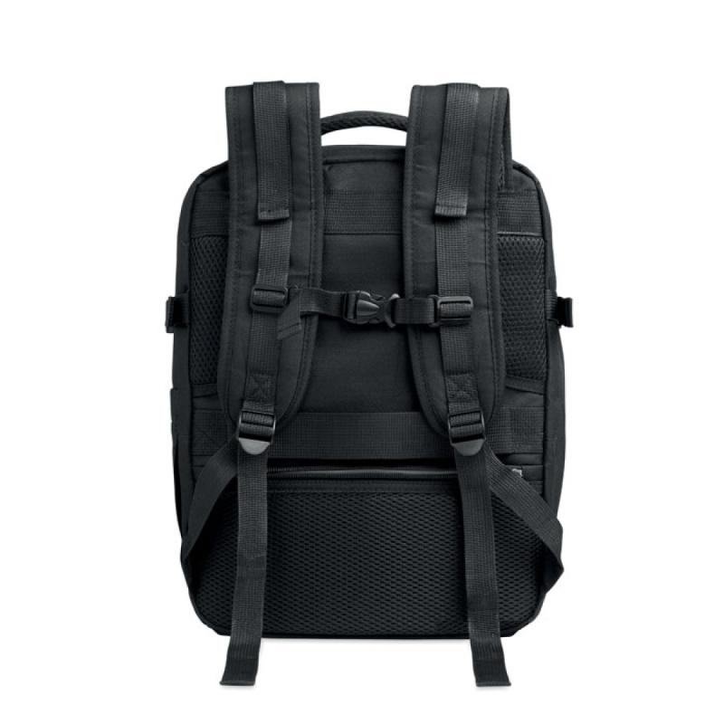 Rozšiřitelný kabinový batoh z polyesteru 600D RPET s PU zátěrem a otevíráním pod úhlem 180. Prostor na boty, polstrovaná kapsa na 15’’ notebook, síťované popruhy, popruh na zavazadla a boční přezky.