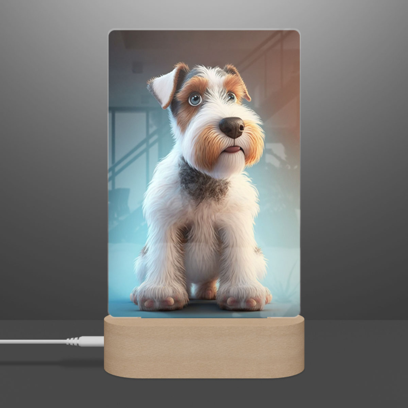Součástí balení je akrylové sklo dle výběru, dřevěný RGB LED stojánek a napájecí USB kabel.