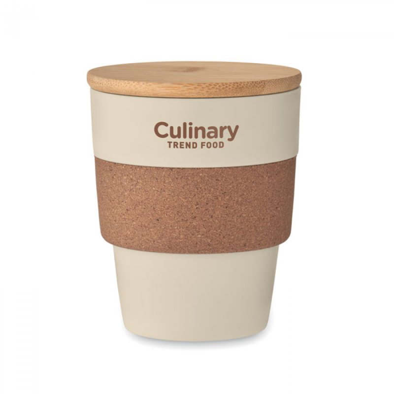 Jednostěnný pohárek z recyklovaného PP s korkovým ochranným prstencem a bambusovým víčkem. Objem: 300 ml. Jelikož se jedná o jednostěnný hrnek, může zde docházet k přenosu tepla. Bambus je přírodní materiál, může dojít k mírným změnám barvy, dekorace a velikosti. Neteče.