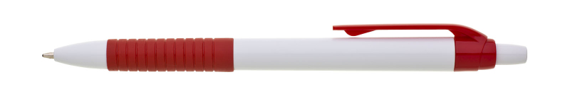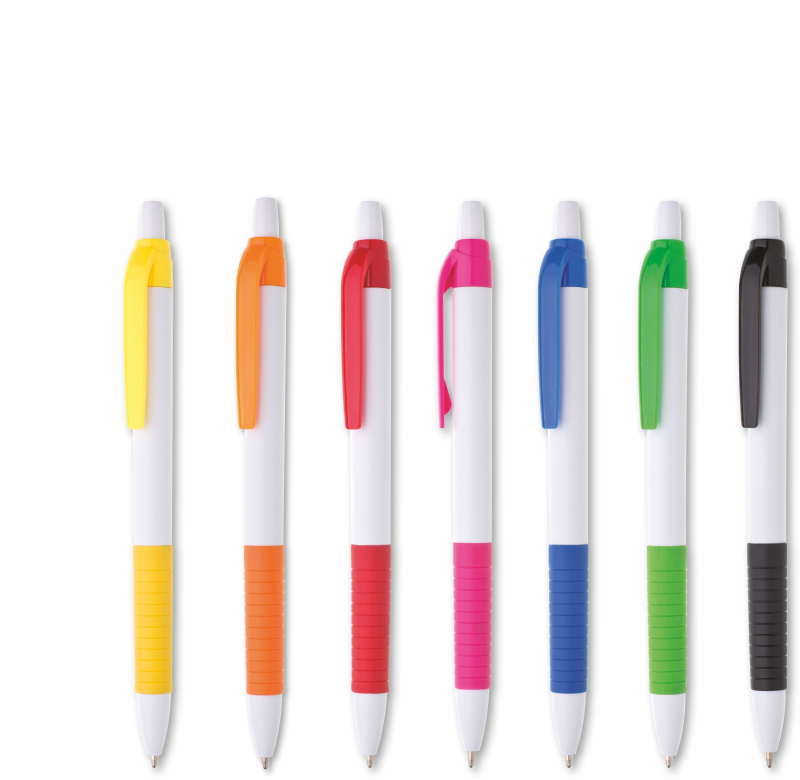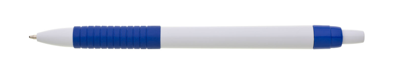 Propiska s bílým tělem, žlutým gripem a klipem, náplň modře píšící.