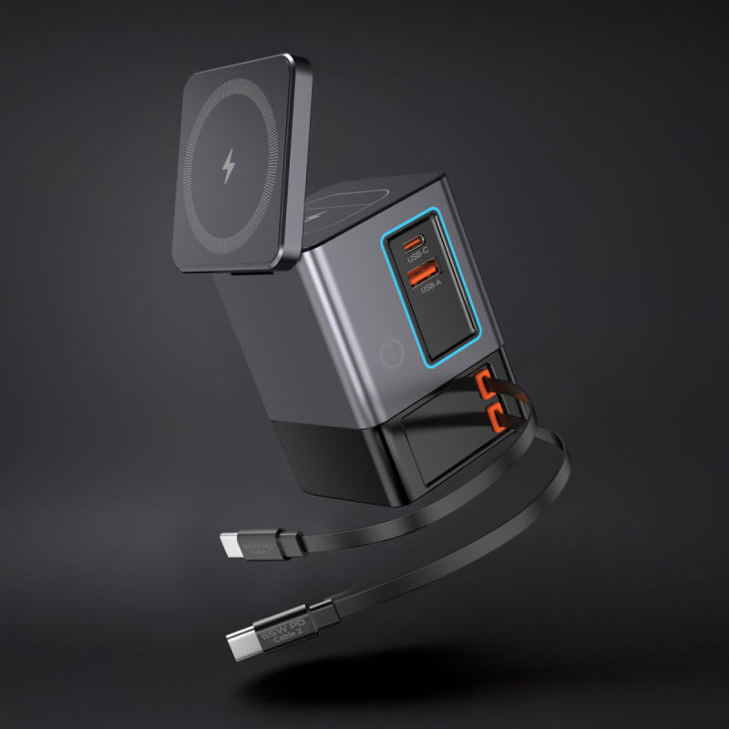 Sacramento je 105W GaN nabíječka, která kombinuje maximální výkon s komfortem. Nabízí dva vestavěné zasouvací USB-C kabely s výkonem 65 W, takže máte rychlé nabíjení vždy po ruce – bez potřeby dalších kabelů. Kromě toho je vybavena USB-A a dalším USB-C portem, což dohromady poskytuje čtyři výstupy pro současné nabíjení notebooků, tabletů, chytrých telefonů a dalších zařízení. Pro bezdrátová zařízení disponuje výkonnou 15W magnetickou bezdrátovou nabíječkou, která pevně drží telefon, a samostatnou bezdrátovou podložkou (5W) určenou pro sluchátka nebo AirPods. Díky moderní GaN technologii je Sacramento kompaktní, efektivní, produkuje méně tepla a spotřebovává méně energie než běžné nabíječky. Vyrobeno z ohnivzdorného recyklovaného PC plastu s certifikací RCS (Recycled Claim Standard), podíl recyklovaného materiálu činí 26 % z celkové hmotnosti.
