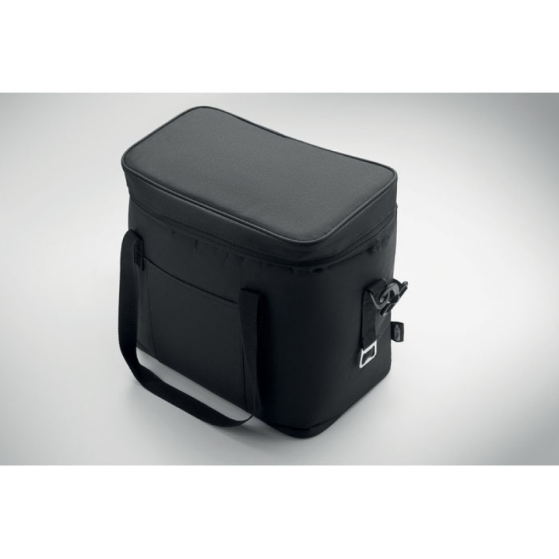Chladicí taška z polyesteru 600D RPET s PU povlakem. Jedna přední kapsa a jedna vnitřní síťovaná kapsa. Izolační podšívka PEVA s 6mm PE pěnou. Dvě ucha a jeden nastavitelný ramenní popruh.
