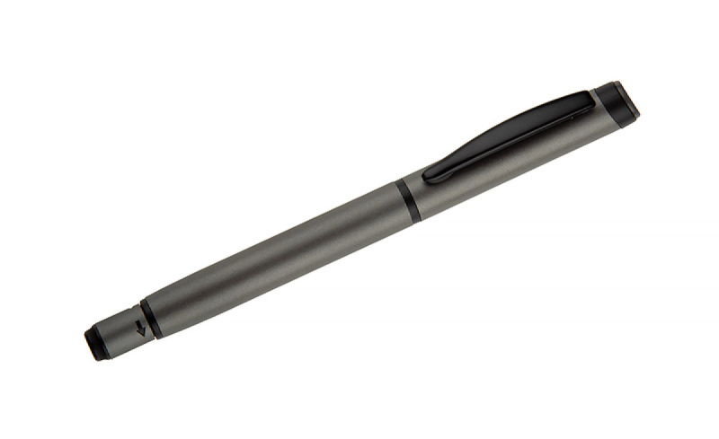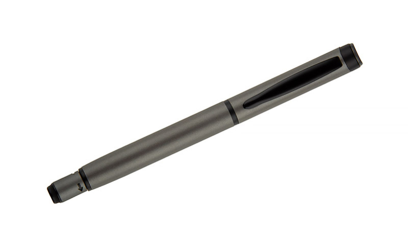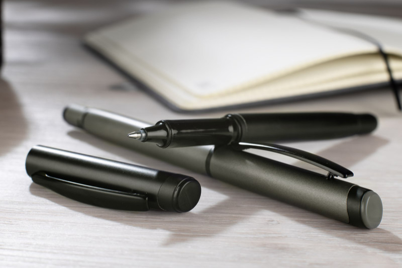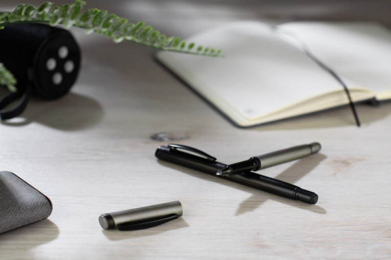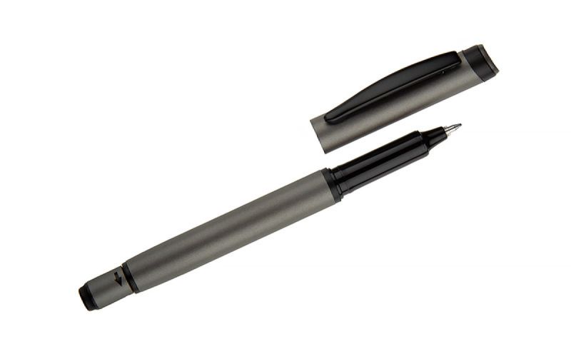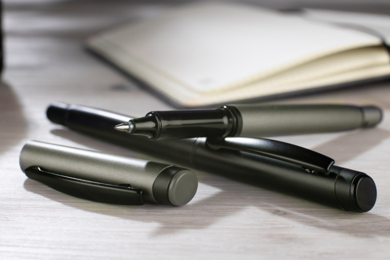 Kuličkové pero ROTIS je hliníkový model s gelovou náplní s volným inkoustem, uzavřený klasickým uzávěrem. Tělo s polomatnou povrchovou úpravou doplňuje černý kovový klip, který dodává elegantní vzhled. Otočný hrot s integrovaným spinnerem slouží jako antistresová funkce - černá šipka vyražená do materiálu na hrotu decentně naznačuje směr otáčení.