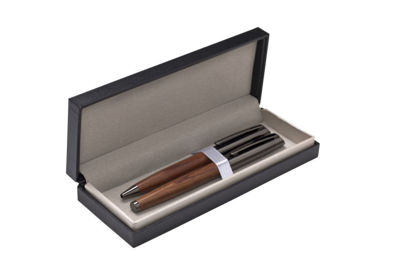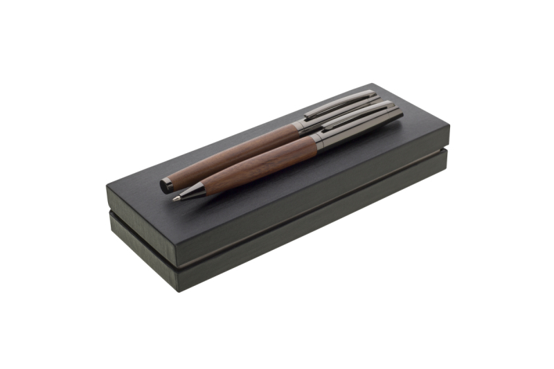 Elegantní sada s propiskou a rollerem Genero ze dřeva a kovu s metalickými doplňky v grafitové barvě, v kombinaci v dárkové krabičce. Kolekce Gabrielis.