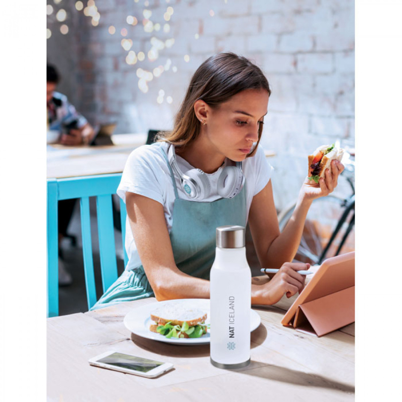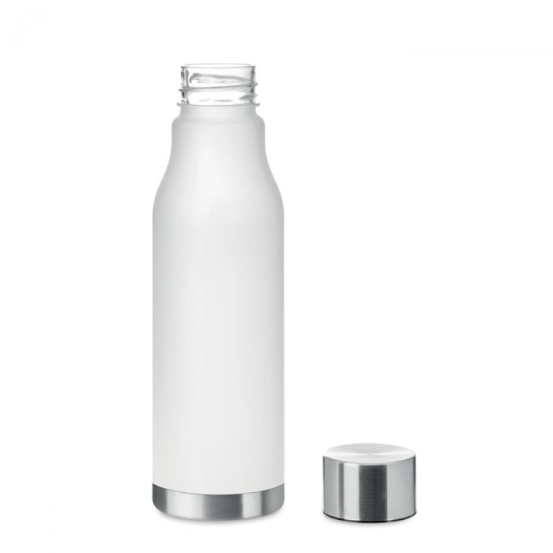 Láhev na pití z RPET s pogumovanou povrchovou úpravou a víčkem z nerezové ocele se silikonovým kroužkem. Bez BPA. Netekoucí. Objem: 600 ml. Nevhodné pro sycené nápojeNeteče.