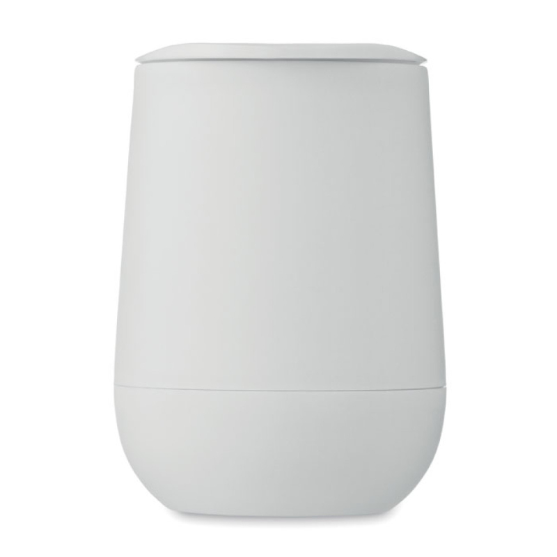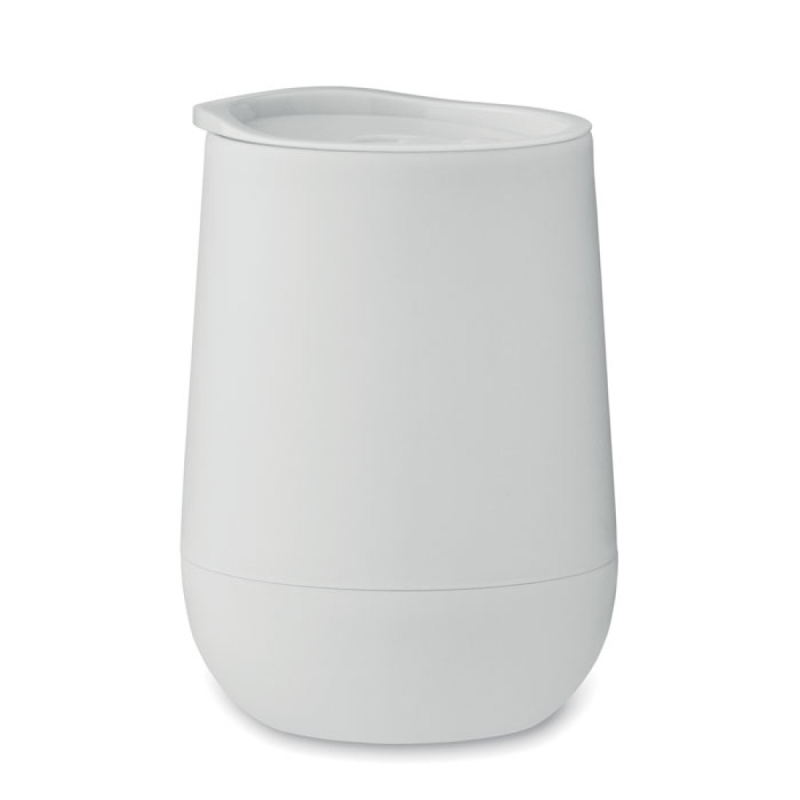 Dvoustěnný pohárek z PP s víčkem s posuvným zavíráním. Materiál víčka PS a ABS. Objem: 300 ml.