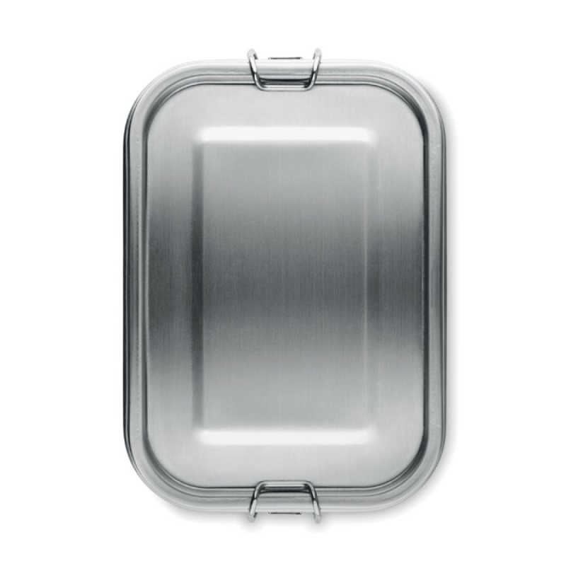 Obědový box z recyklované nerezové oceli (90 % recyklované nerezové oceli a 10 % nerezové oceli) s bezpečnými bočními sponami a zaoblenými rohy. Objem: 750 ml.