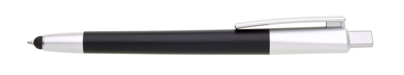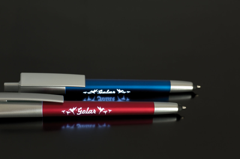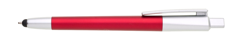 Červená plastová propiska s touch koncem a led světlem uvnitř těla. Po vylaserování loga vzniká svítící efekt.