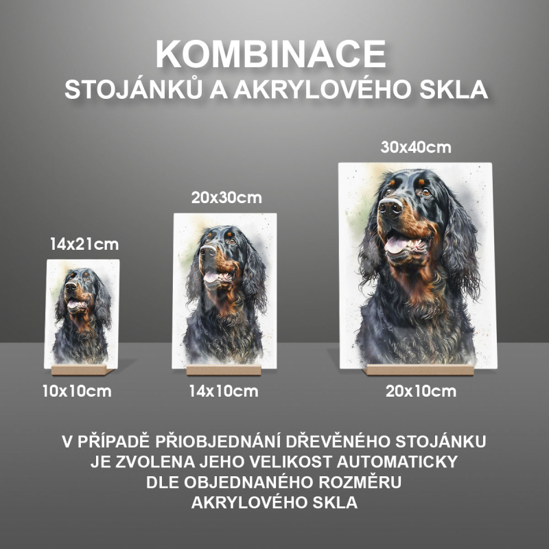 Na produktovém fotu vyobrazena nejoblíbenější varianta akrylového skla 14x21cm a dřevěný stojánek 10x10cm.