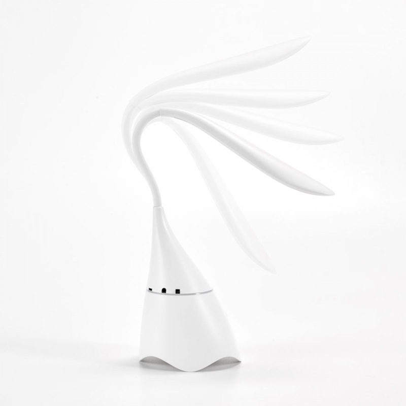 Stolní lampa z ABS s reproduktorem. Tato elegantní a zajímavá lampa obsahuje 18 LED diod s vysokým jasem, dotykové, tlačítko a flexibilní rameno. Umožňuje bluetooth přenos, stereo připojení 3.5 mm, má výkon 5W/4 Ω a samostatný provoz až 6 hodin. Vedle přenosnosti umožňuje rovněž připojení k seznamu skladeb mobilního zařízení a zahrnuje USB kabel na nabíjení. Výrobek se dodává v dárkové, krabičce. 100 x 225 x 100 mm | Krabička: 110 x 235 x 105 mm