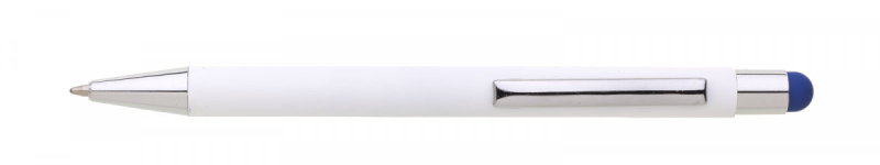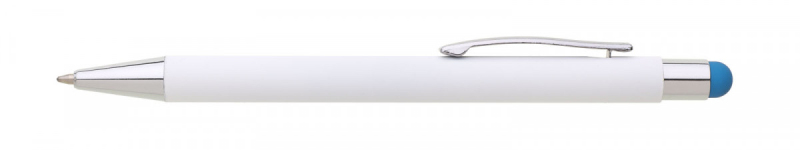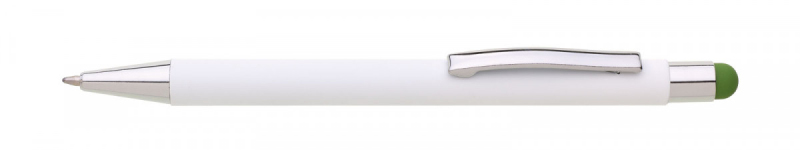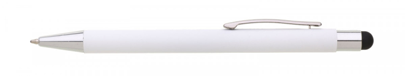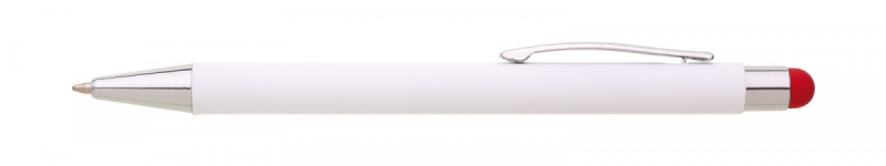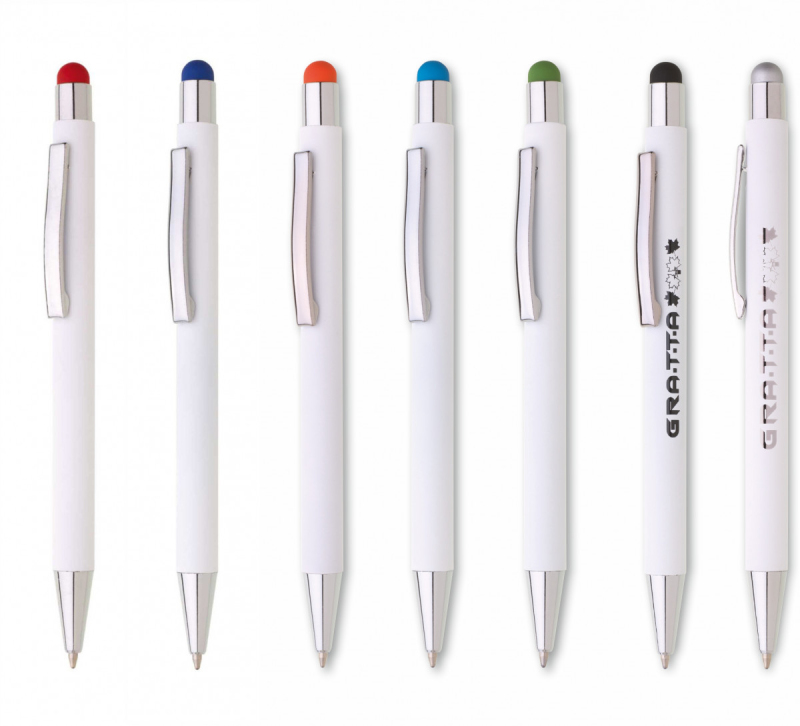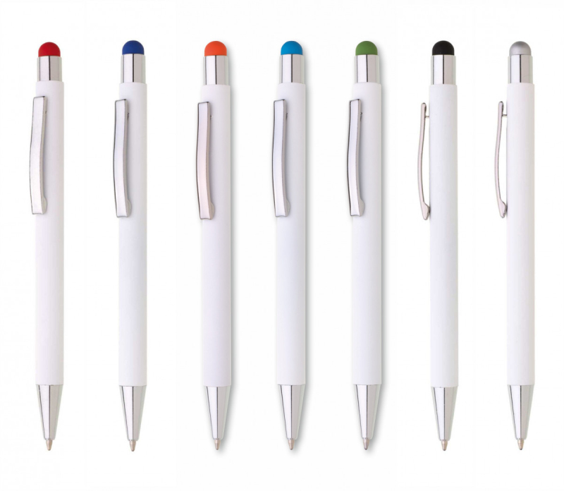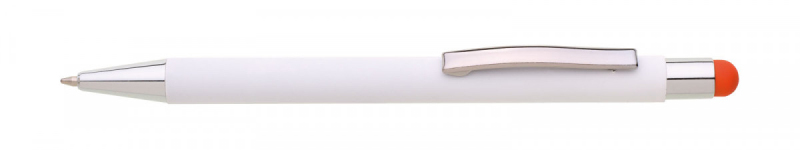 Bílá kovová propiska se soft povrchem a oranžovým touch koncem. Logo po vylaserování je v barvě touch.