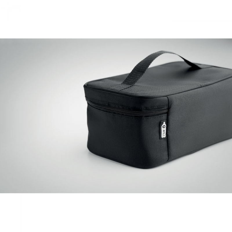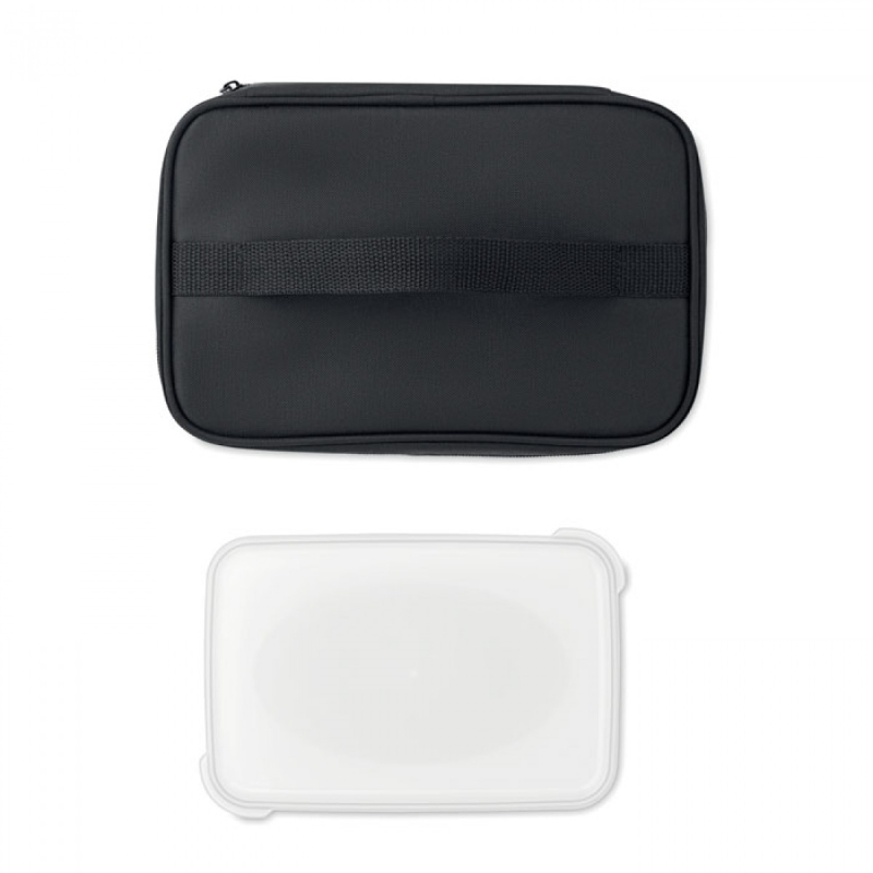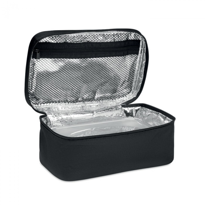 Izolovaná termotaška z 600D RPET včetně opakovaně použitelné krabičky z PP o objemu 1900ml. 2mm podšívka z hliníkové fólie.