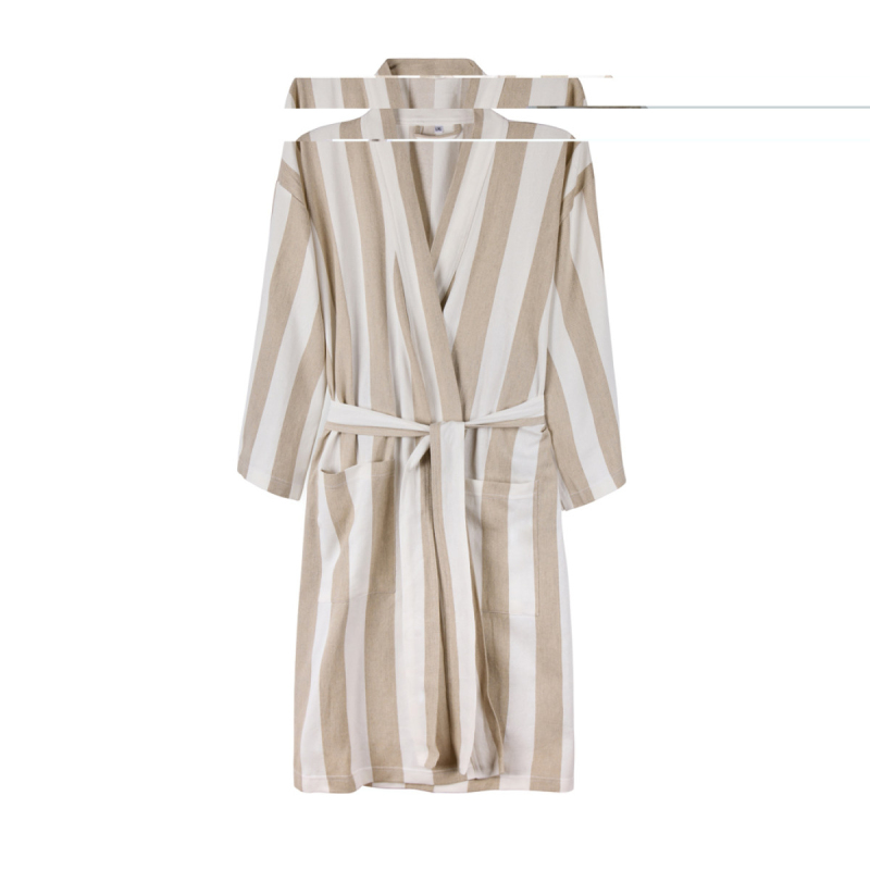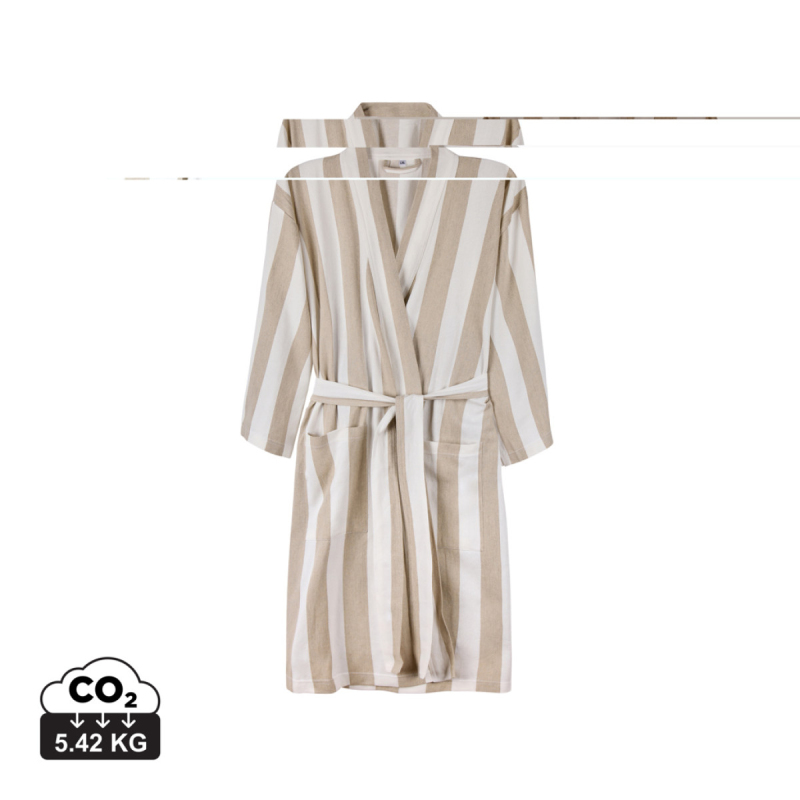 Vezměte si tento měkký a pohodlný župan hamam na pláž nebo si ho jednoduše užijte doma. Je vyroben z lehké a vzdušné směsi o gramáži 200 g/m2 a kombinuje pohodlí bavlny s rychleschnoucími vlastnostmi polyesteru. Je navržen s dvoubarevným pruhovaným vzorem, má elegantní límec, přední kapsy, 3/4 rukávy a pásek v pase pro dokonalé přizpůsobení. Certifikace GRS zaručuje, že celý dodavatelský řetězec recyklovaných materiálů je certifikován. Celkový obsah recyklovaných materiálů vychází z celkové hmotnosti výrobku. Tento výrobek obsahuje 69 % recyklované bavlny s certifikací GRS a 29 % recyklovaného polyesteru s certifikací GRS.