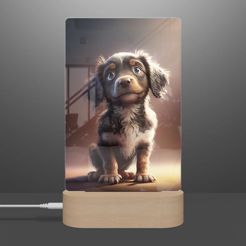 Součástí balení je akrylové sklo dle výběru, dřevěný RGB LED stojánek a napájecí USB kabel.