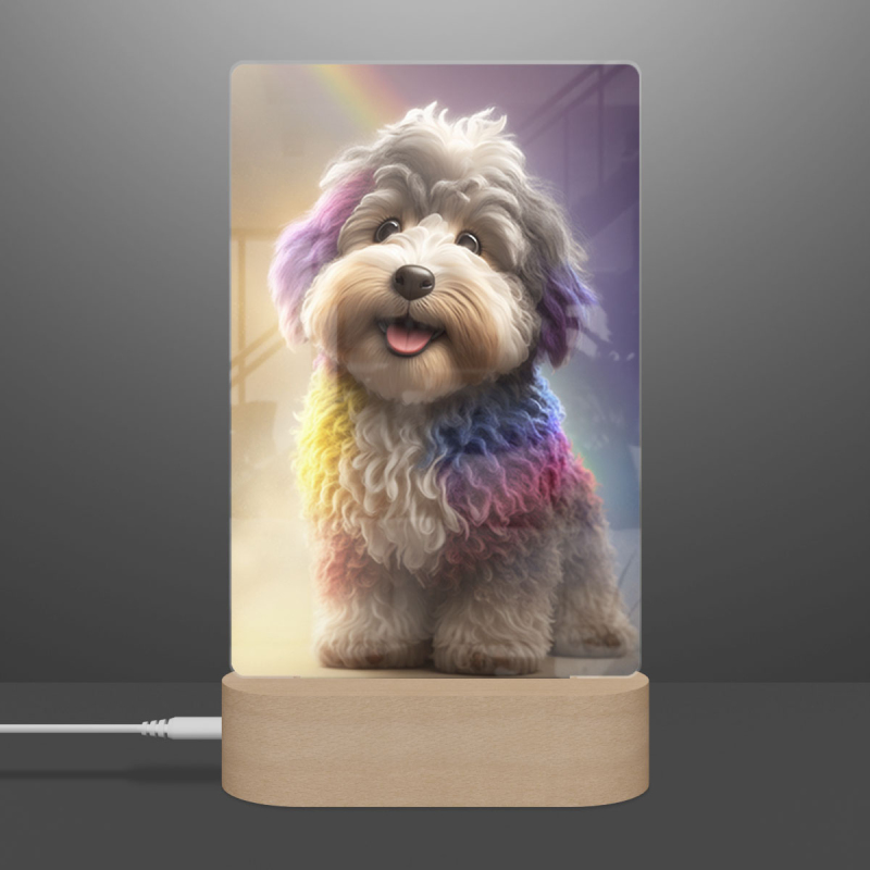 Součástí balení je akrylové sklo dle výběru, dřevěný RGB LED stojánek a napájecí USB kabel.